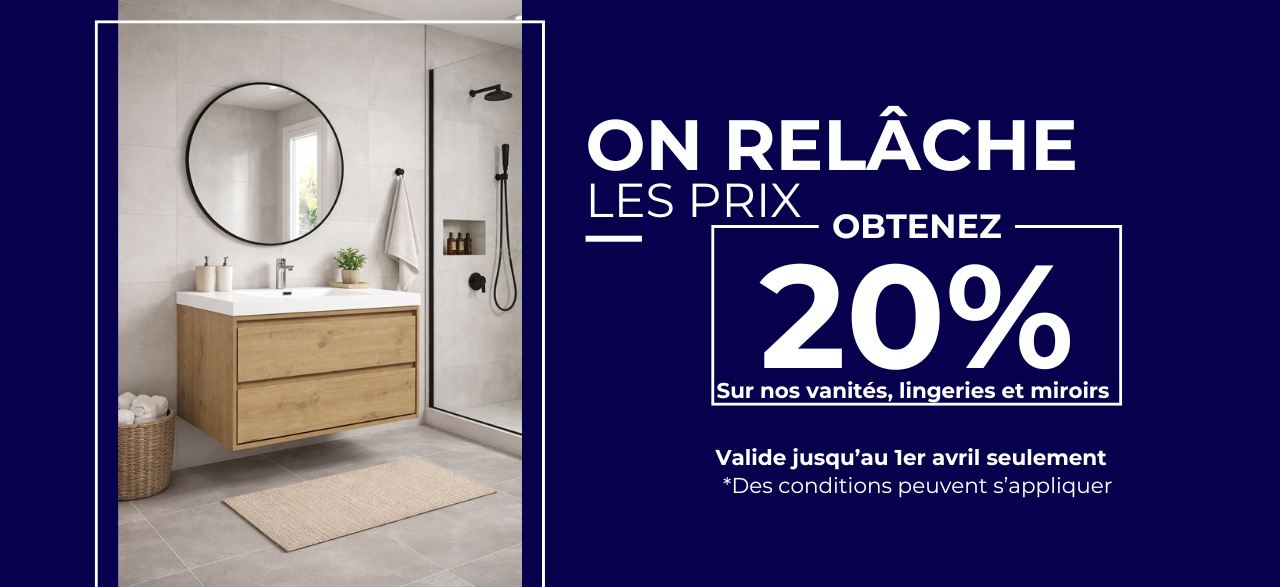 Venez stimuler votre imagination en visitant notre salle de montre de 6 000 pieds carrés à Laval. Pas moins de 30 salles de bain de tous les styles – moderne, classique, rustique, etc. – sont exposées en magasin. Plusieurs aménagements combinant meubles-lavabos, armoires, bains autoportants, bains-douches, colonnes de douche, robinets, ensembles et bases de douche, armoires à pharmacie, niches, toilettes , miroirs et autres accessoires sont proposés. Vous y trouverez certainement l’inspiration pour votre projet de rénovation !