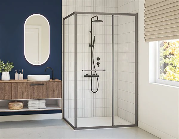 - Porte de douche coulisse vers l’intérieur qui glisse à 90° pour rester parallèle au panneau de retour lorsqu’elle est complètement ouverte